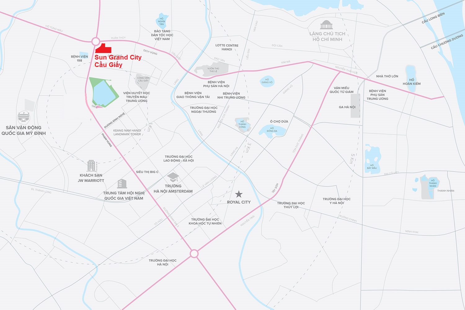 - Bao quanh bởi hệ thống tiện ích ngoại khu đẳng cấp: Gần các trung tâm thương mại lớn như Vincom, Big C Thăng Long, hệ thống trường học danh tiếng như Đại học Quốc gia Hà Nội, Đại học Sư phạm Hà Nội, và các bệnh viện lớn như Bệnh viện 198, Bệnh viện E.